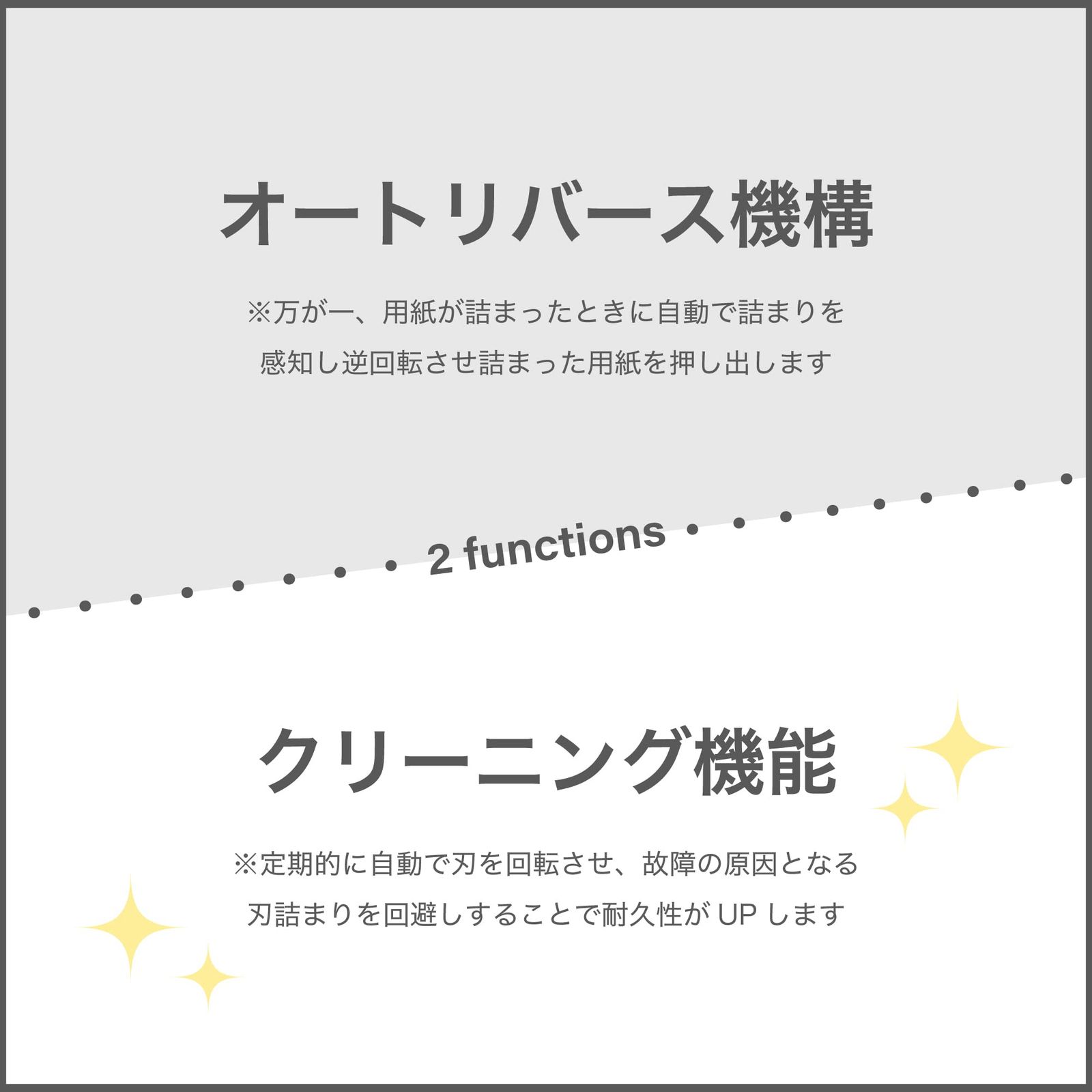 オートクリーニング機能搭載で定期的に詰まった紙を取り除いてくれます。手動機能もあり。修理の原因の一つにある紙詰まりによる動力部の不具合やギア破損などがありますが、これらのリスクを軽減します。