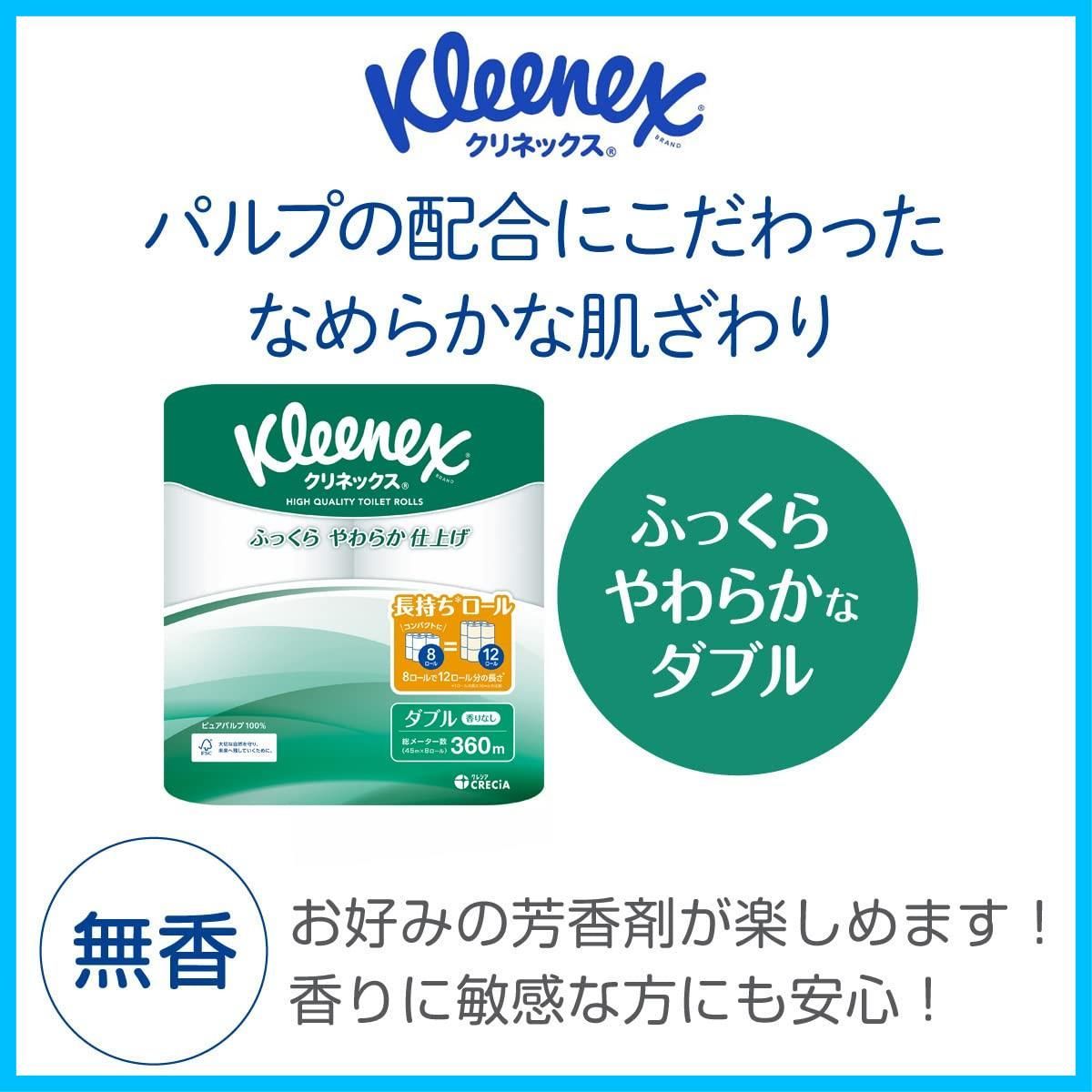 ふっくらやわらかなクリネックスの長持ちトイレットロール。45mダブル×8ロール。省スペースで保管もスッキリ。たっぷり使えて取り替えの手間が軽減。きめ細やかなソフトタッチエンボス加工で、ふっくらふんわりとした拭きごこち。ピュアパルプ100%。無香料タイプ。外装フィルムはバイオマスインキ使用で環境にも対応しています。
