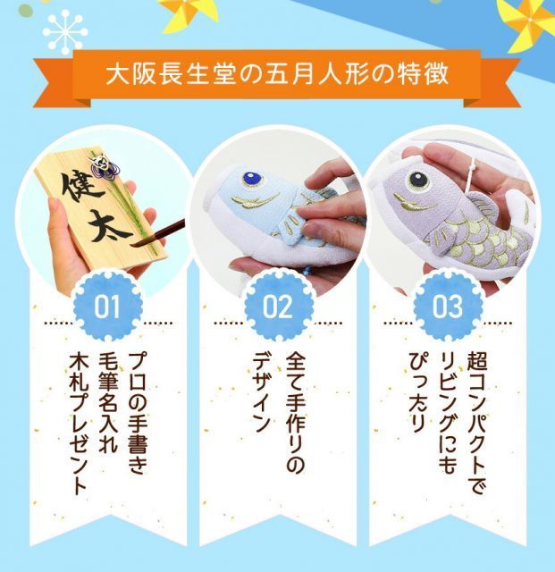 当店で扱う五月人形は最近の住宅事情を踏まえ、机の上に簡単に、コンパクトに飾れるような可愛い五月人形や鯉のぼりばかりです。