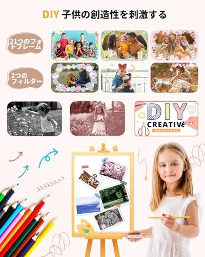 【2.0インチ大画面・日付機能付き】子供用プリントカメラは安全基準を備えた環境に優しい素材で、非毒性、耐衝撃性、耐久性のある素材。子供の目の健康に配慮された設計になっている、2インチカラーIPSスクリーンを採用されます。撮影を重ねることで、子供自身の撮影テクニックも向上していくでしょう。日付機能付き、撮影時のタイムスタンプとしても重要、保護者が子供の活動を把握するのにも利