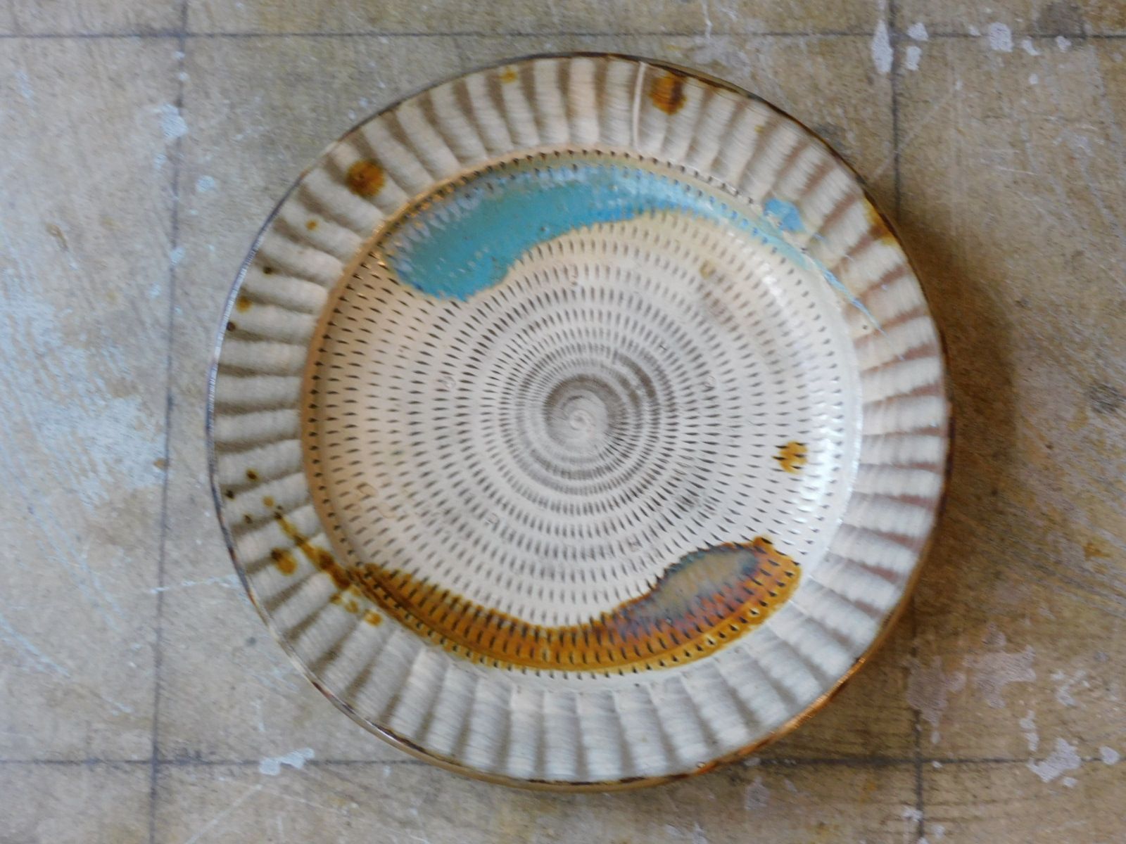 小鹿田焼 二彩 とび鉋 大皿 直径285 mm HK-a-05886 | 古道具 古陶磁 李朝 白丹波 デルフト 粉引 白磁 ボウル