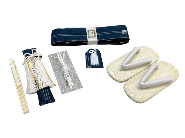 七五三 こども袴セット 3歳 男の子用 袴 紐下55 cm 小物 7点セット 合繊 紺地 金襴縞 IHB 404 55