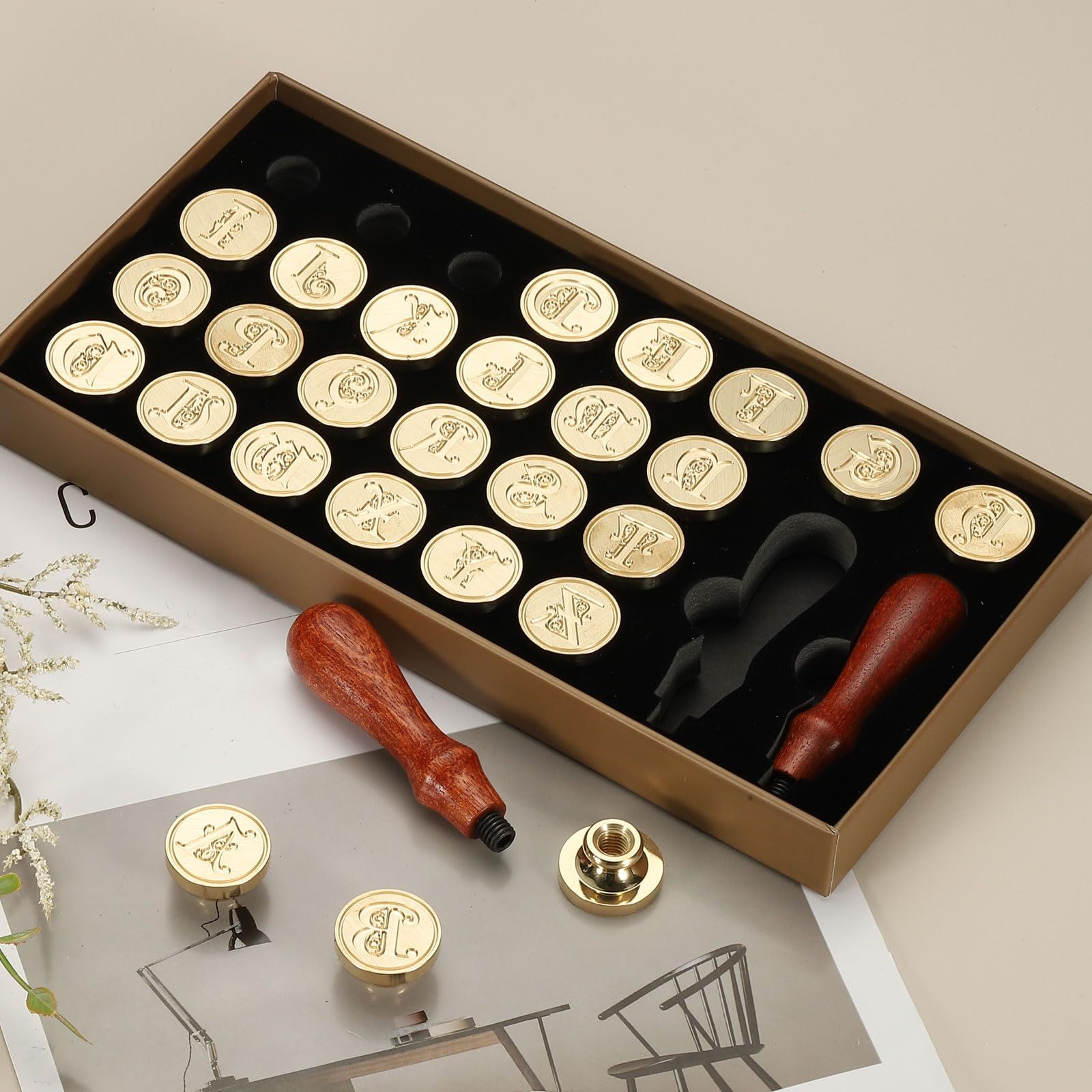 WHAT YOU GET - パッケージには26個のアルファベットワックスシールスタンプ(パターンA-Z)が付属しており、取り外し可能なハンドルヘッドが2個付属しています。