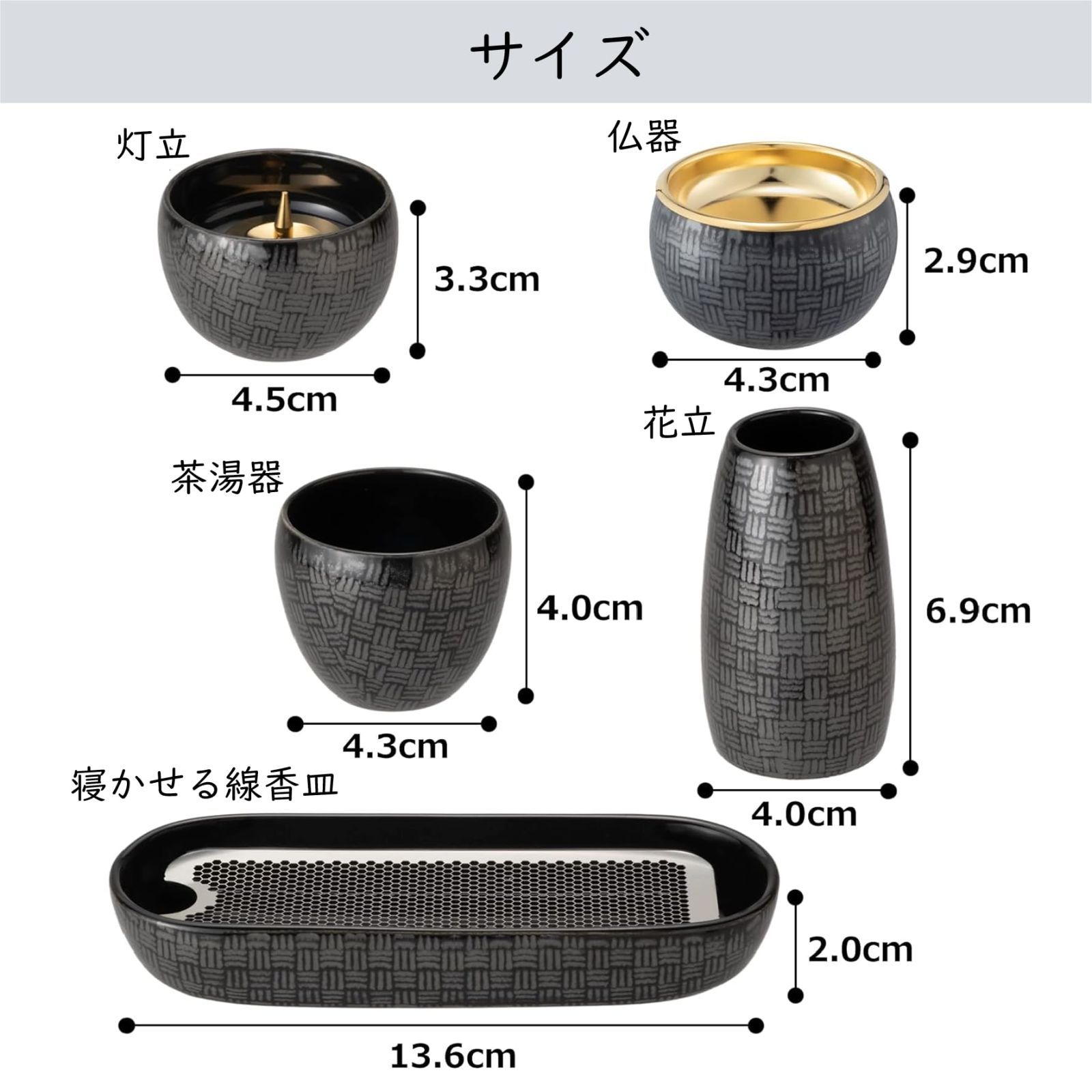 花立、灯立、寝かせる線香皿、茶湯器、仏器のセットでのご用意があります。おりんや香炉など、同一の柄のシリーズも取り揃えているため、統一感のあるお仏壇を演出できます。
