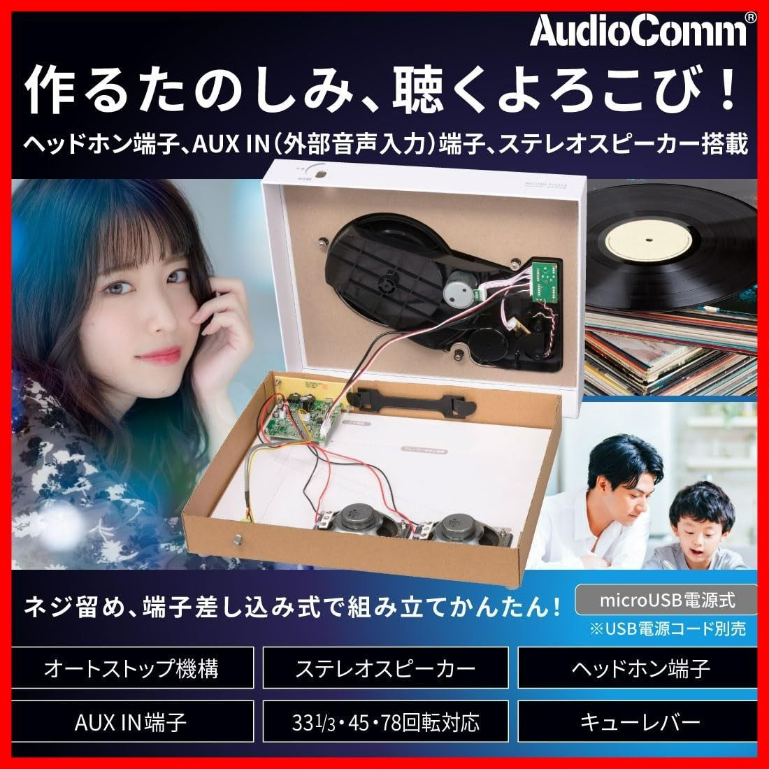 【 特 長 】 ◆とっておきのレコードを自作プレーヤーで楽しめます ◆ネジ留め、端子差し込み式で組み立てかんたん ◆ステレオスピーカー内蔵 ◆ヘッドホン端子、AUX IN(外部音声入力)端子搭載 ◆キューレバー付き ◆オートストップ機構 ◆33 1/3・45・78回転対応 ◆microUSB電源式(USB電源コード別売)
