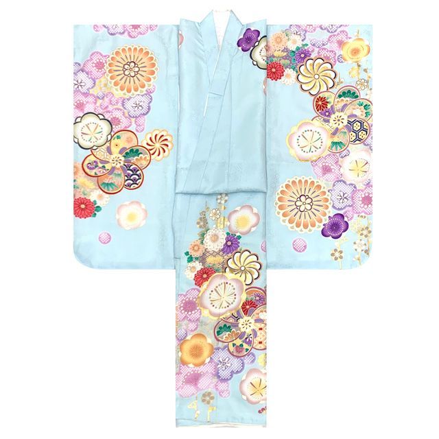 七五三 着物 フルセット 上質合繊 7歳 四つ身の着物と結び帯 オリジナルコーデセット 水色系 ねじり梅 TSRKsz Ed 105 GR