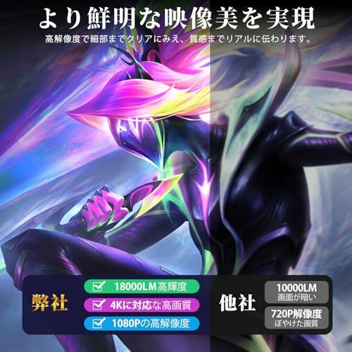 【2024年新登場! 実用性が高い】他店のプロジェクターと比べ、弊店の小型プロジェクターは18000ルーメンで高輝度、270回転可能、4Kに対応で高画質と高解像度、Android TV搭載、低遅延Wi-Fi 6、Bluetooth5.4搭載で超高速転送、高音質HIFIスピーカーや自動台形補正など優れた機能をたくさん持っています。更に日本語、英語、中国語、スペイン語など51種類の言語をサポートしており、どこの国の人でも簡単に操作できます。そして、日本語説明書もあり、初心者でも困りません。