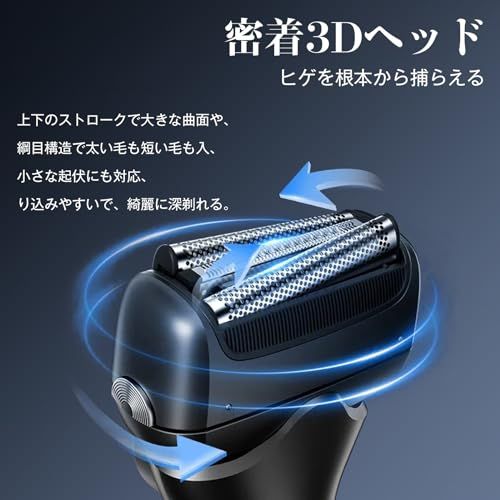 【強力モーター搭載・密着3Dヘッド】メンズシェーバーの強力モーターを採用しており、高速でパワーが強く多くのヒゲををまとめて剃れ、根元からしっか深剃りができます。抜群な切れ味で毛を引っ張ることの心配もなく、優しく髭を剃ることはでき、シェービング時間が短縮されます。往復式シェーバーの3枚刃ヘッドでお肌への負担も減らし、顔、首、顎の輪郭の曲面から小さな起伏までの凹凸に密着することで効率的に剃り切ります。