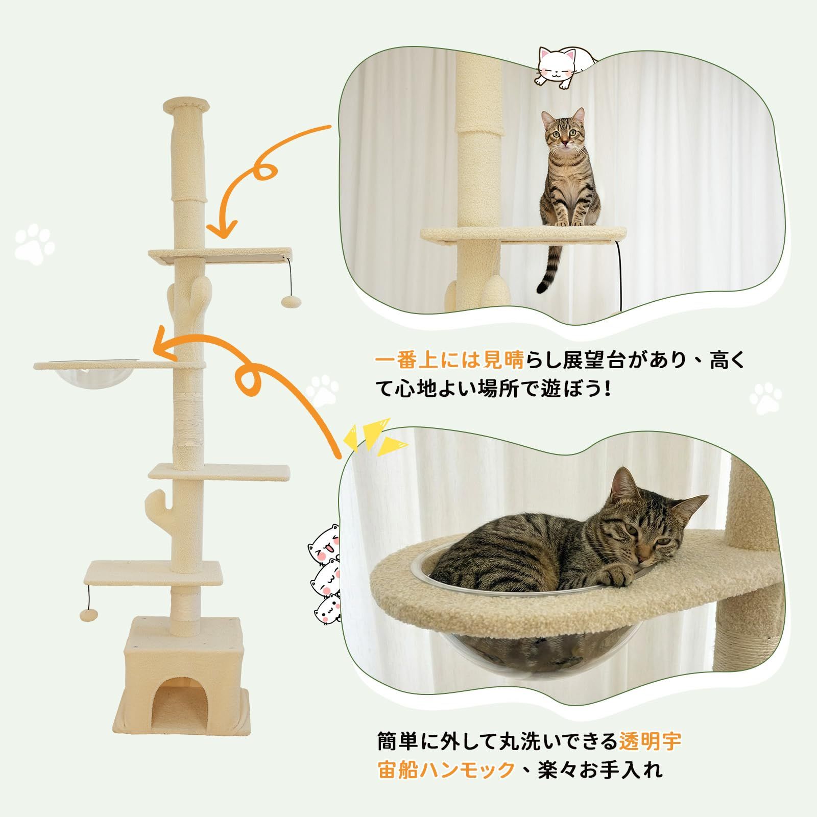 Footstep キャットタワー 猫タワー 突っ張り スリム 省スペース 据え置きタイプ 大型猫対応 多頭飼い 極太支柱 麻紐爪とぎ 宇宙船ハンモック付き ねこハウス ボンボン 組み立て簡単 据え置きタイプ 運動不足解消 高さ調整可能 235-260cm 日本語説明書付き (ベージュ, シングル式)