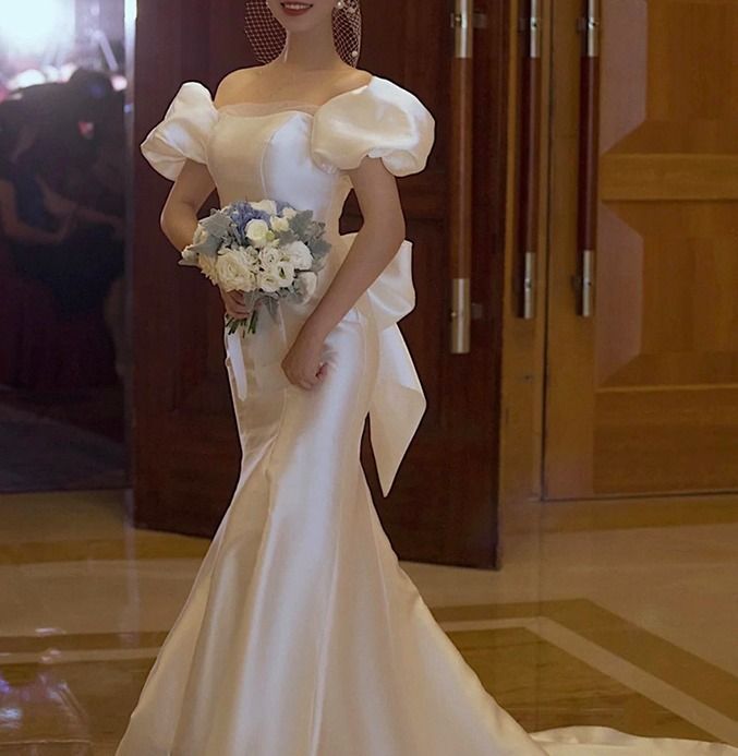 ロング ドレス ウェディング サテン リボン フィッシュテール