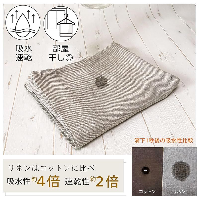 【どんどん水分を吸収して、すぐ乾く】リネンはコットンに比べて、吸水性率は約4倍、速乾性は約2倍といわれています。 素早く水を吸い取る上にすぐ乾き、梅雨時や冬のお洗濯も安心です。