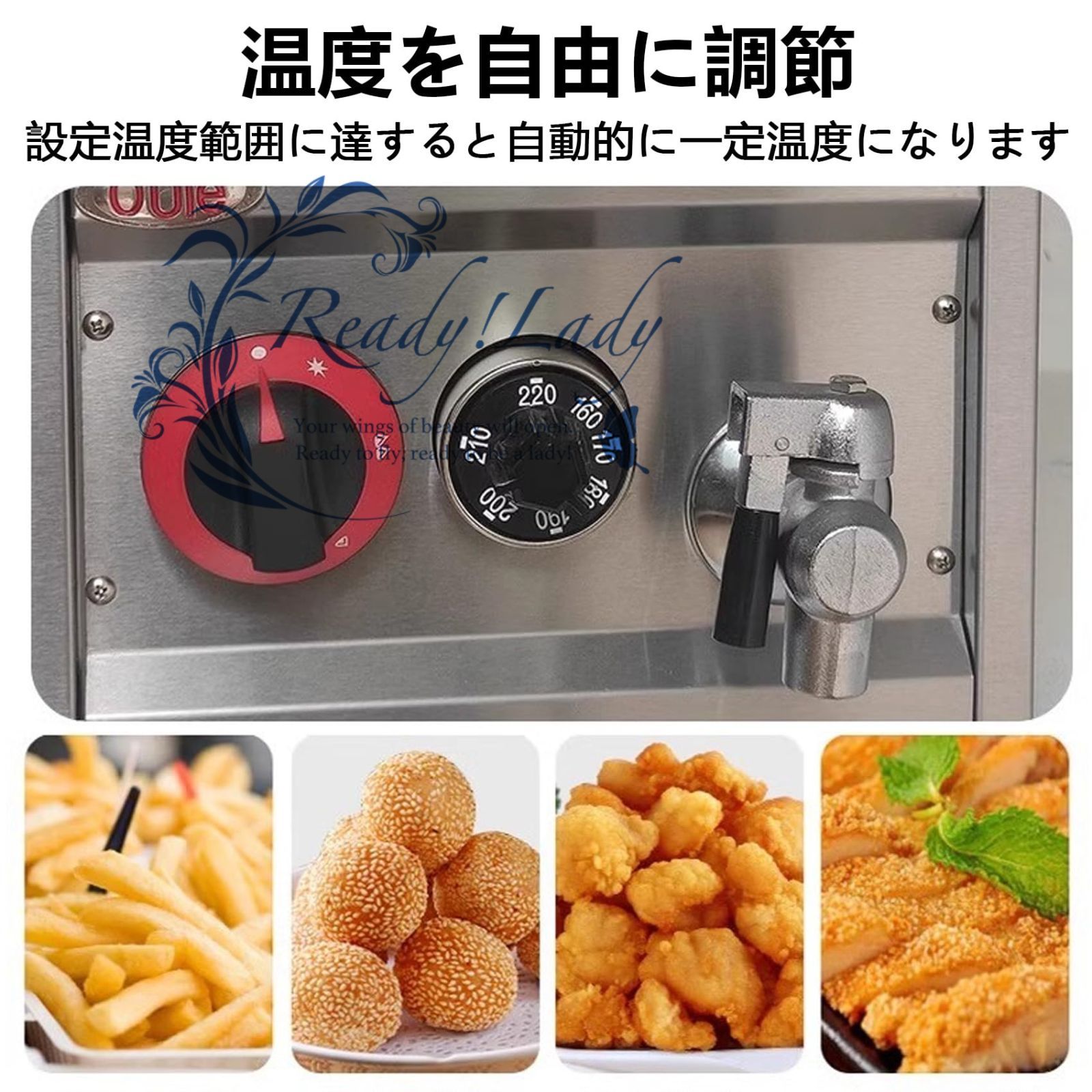 【自由温度調節】業務用フライヤー160~220℃の間で温度を自由に調節でき、自動恒温機能も搭載しています。フライドポテト、フライドチキン、ゴマ団子など、食材に合わせて最適な温度に調整できるため、サクサクとした食感と栄養価の高い揚げ物を実現するだけでなく、省エネ・省油で揚げ物を楽しむことができます。