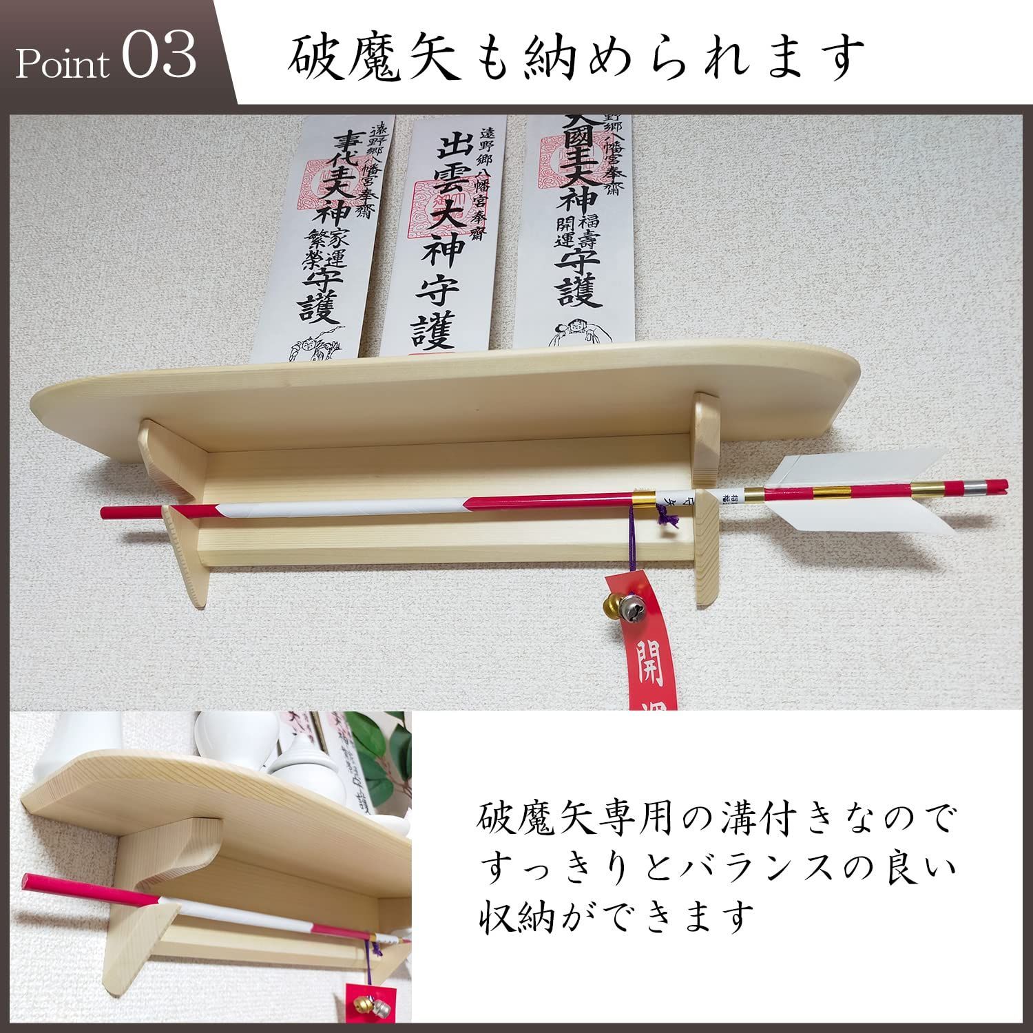 御札3枚、破魔矢、榊立、盛り塩がまとめて陳列できます
