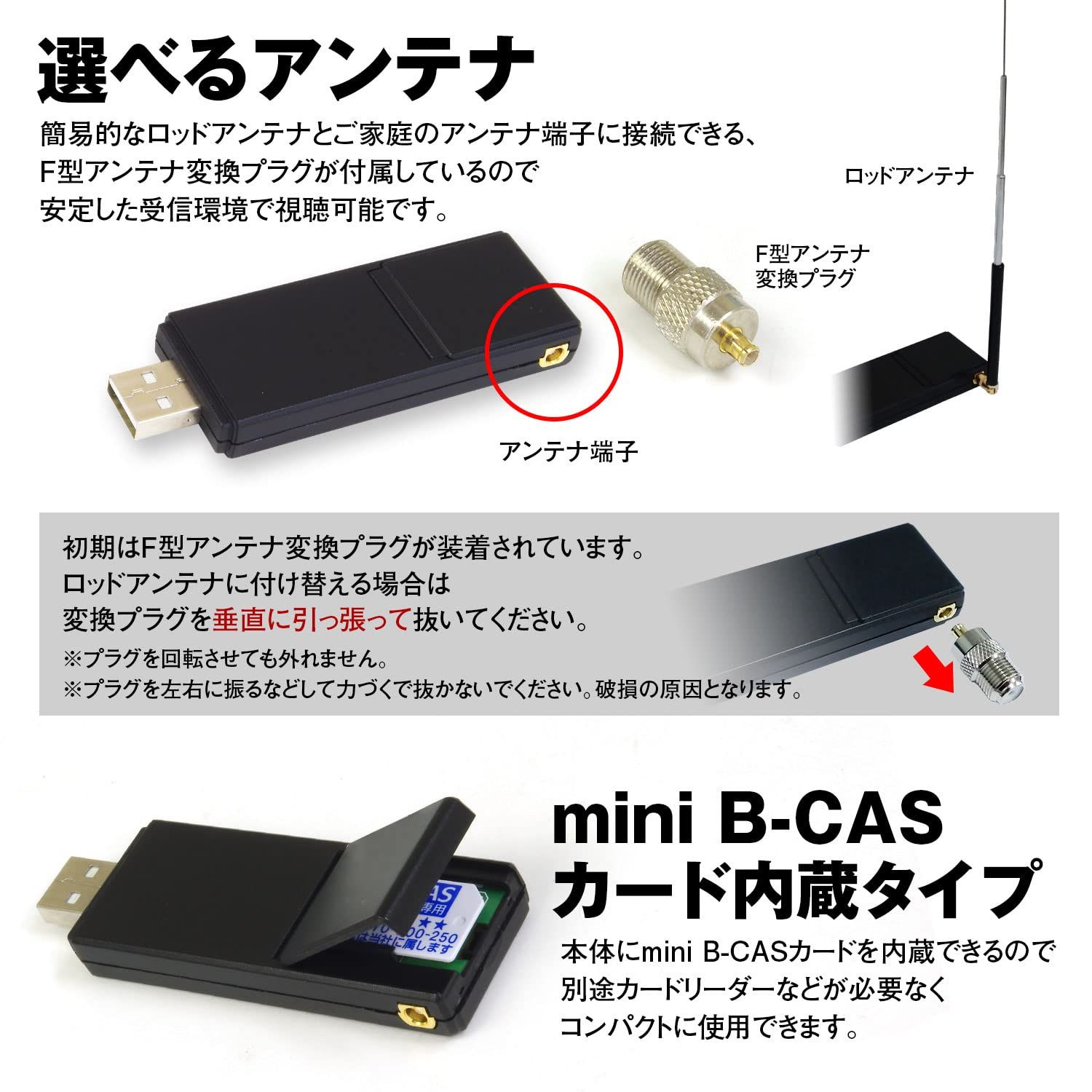 簡易的なロッドアンテナと、ご家庭のアンテナ端子に接続できるF型アンテナ変換プラグが付属しているので、安定した受信環境で視聴可能です。