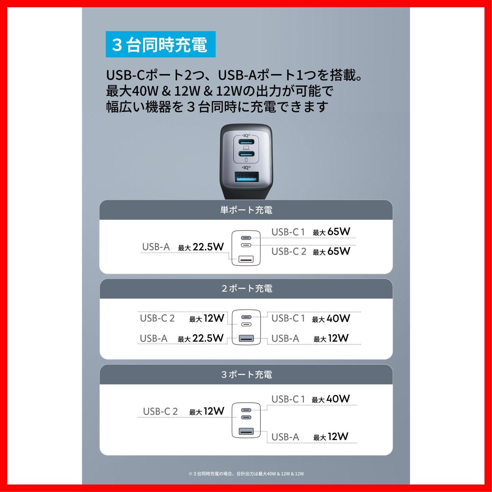 3ポート利用時の合計最大出力は65Wと高出力