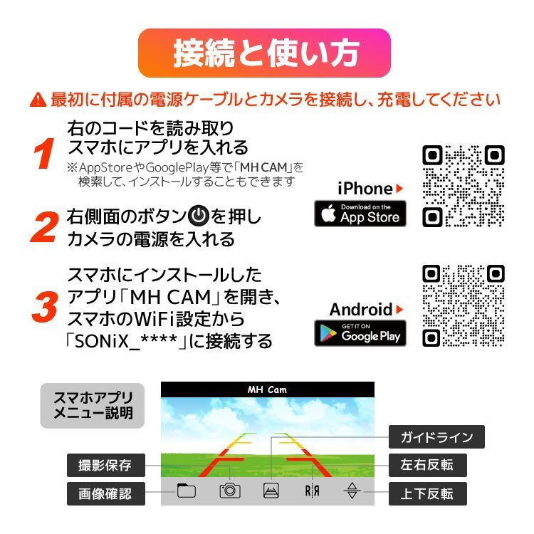 ※AppStoreやGooglePlayなどで「MH CAM」を検索し、インストールしてください