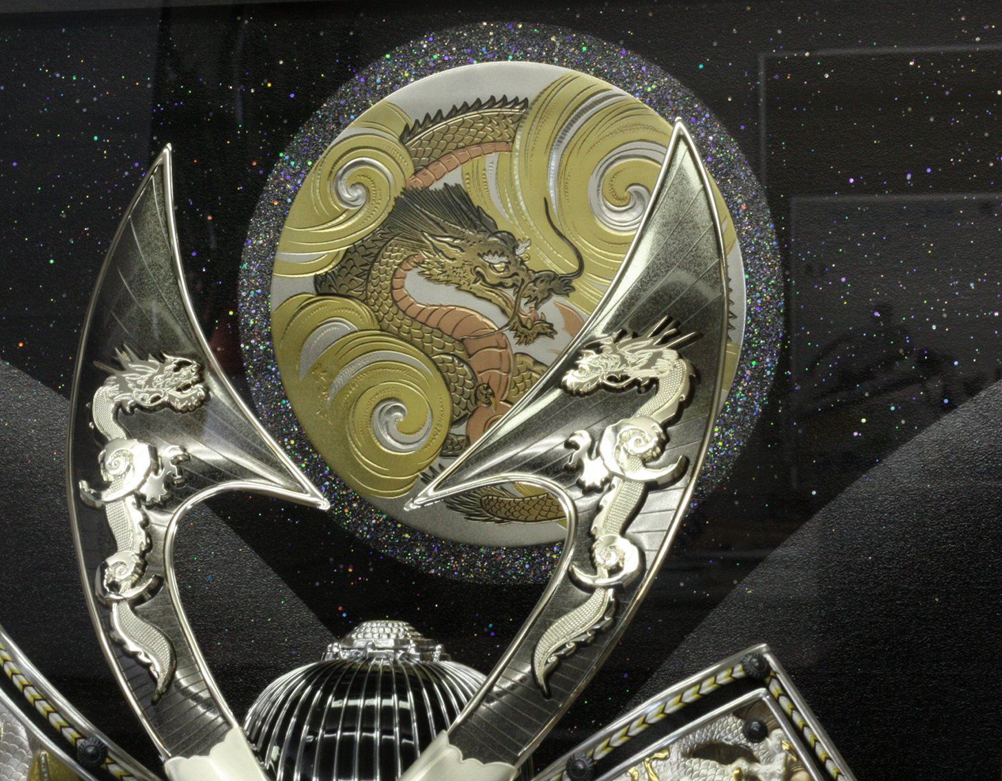 ケースバックには満月を思わせるような丸い龍の彫金細工を配しました