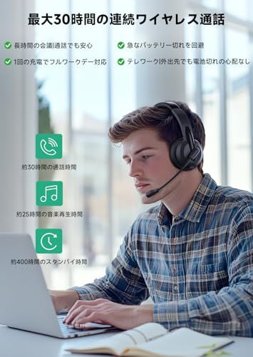 【大容量バッテリー&急速充電対応長時間の業務も安心】このPC用ワイヤレスヘッドセット(マイク付き)は、お客様のワークスタイルに応える優れたバッテリー性能を誇ります。わずか2.5時間のフル充電で、最大30時間の通話時間または25時間の音楽再生が可能です。長時間の会議や研修、休憩中の音楽視聴まで、1日中安心して使える設計です。頻繁な充電の手間から解放され、業務に集中できるビジネス用ワイヤレスヘッドセットとして、在宅勤務やコールセンター業務にも最適のヘッドフォンです。有線ヘッドセットとしても使用可能で、「バッテリー残量が不安で中断される」ことなく、重要な仕事に集中できる環境をサポートします。