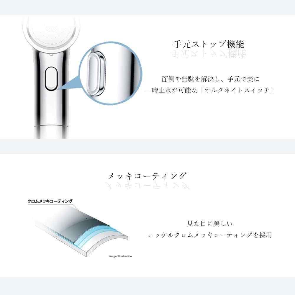 【ナノサイズの気泡「ナノバブル」が肌を美しく清潔に】高機能ナノバブルシャワーヘッドBIRAKUはナノバブル機能を搭載しています。特殊な形状の機構により、表面にマイナス電荷を帯びたナノサイズの気泡「ナノバブル」を多量に発生させ、細かい汚れを吸着します。毛穴よりも小さなナノバブルは肌や頭皮の奥まで届いて皮脂や汚れを落とし、髪や肌に更なる潤いを与えます。【節水型超精密散水板】ステンレス製節水板の孔数の合計はΦ0.4×90個、Φ0.3×149個の合計239個で平均Φ0.3mmの水流を作り出します。肌へのやさしさにこだわった柔らかな極細水流は敏感肌の方にも刺激が少なく、優しく汚れを洗い流します。散水板の目の細やかさは節水にもつながり、水道代・ガス代合わせて年間約61,212円もの節約に(東京都23区内4人家族で1人当たり1日7分使用した場合)。一人暮らしの方でも年間約15,300円の節約になります。(基本料金を含んで算出)【傷や汚れに強いメッキコーティング】見た目に美しいニッケルクロムメッキコーティングを採用しています。シルバーの光沢はバスルームを美しく演出します。【手元で簡単ストップ】出しっぱなしのシャワーを手元で簡単にストップすることができます。簡単かつわかりやすい「オルタネイトスイッチ」を採用。面倒や無駄を解決し、手元で楽に一時止水が可能な機能です。【商品仕様】◇本体サイズ:60×75×230cm