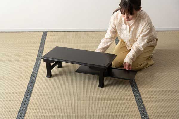 小ぶりなサイズのテーブルとしてもご使用いただける大きさです。ぼんやりとした光沢が格調高い趣のある雰囲気を演出します。また天板にあしらわれた段付き小口は高級感を演出し、クラシックで和モダンな印象に仕上げました。棚板は薄く木縁で覆ったトレー型になっています。脚は床に向かって太くなる形状で、安定感と畳にもやさしい設計です。※棚板を取り外してのご使用はできません。