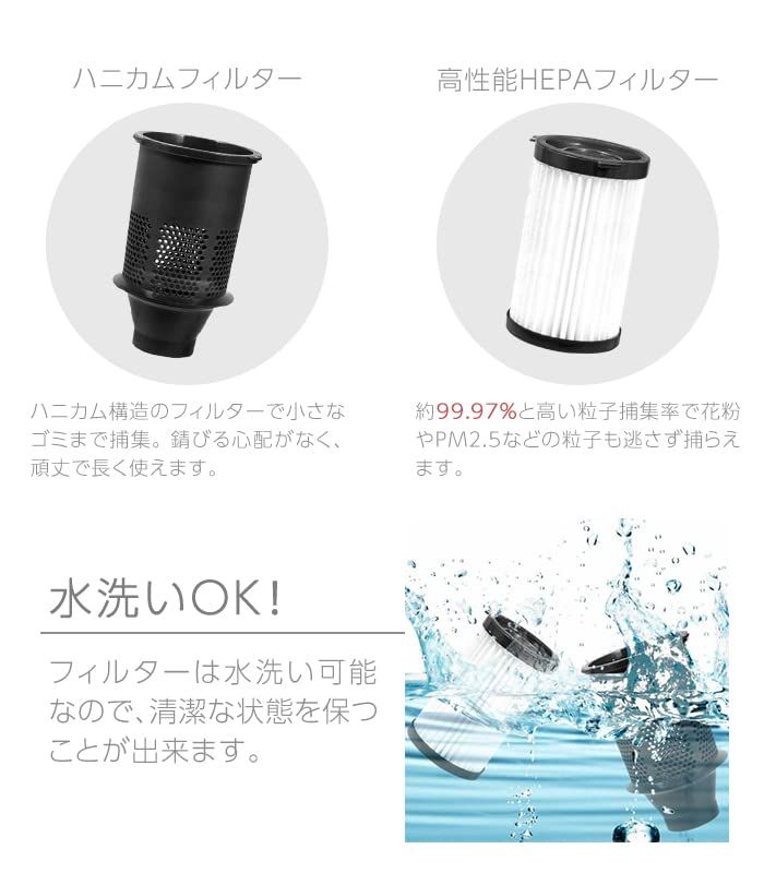 【Wフィルター構造】高性能HEPAフィルター:約99.97%と高い粒子捕集率で、花粉やPM2.5などの粒子も逃さず捕らえます。 ハニカムフィルター:ハニカム構造のフィルターで小さなごみまで捕集。素材は金属ではないので、錆びる心配がなく、頑丈で長く使えます。更にこの2つのフィルターは水洗いOKです。 清潔な状態を保つことができます。