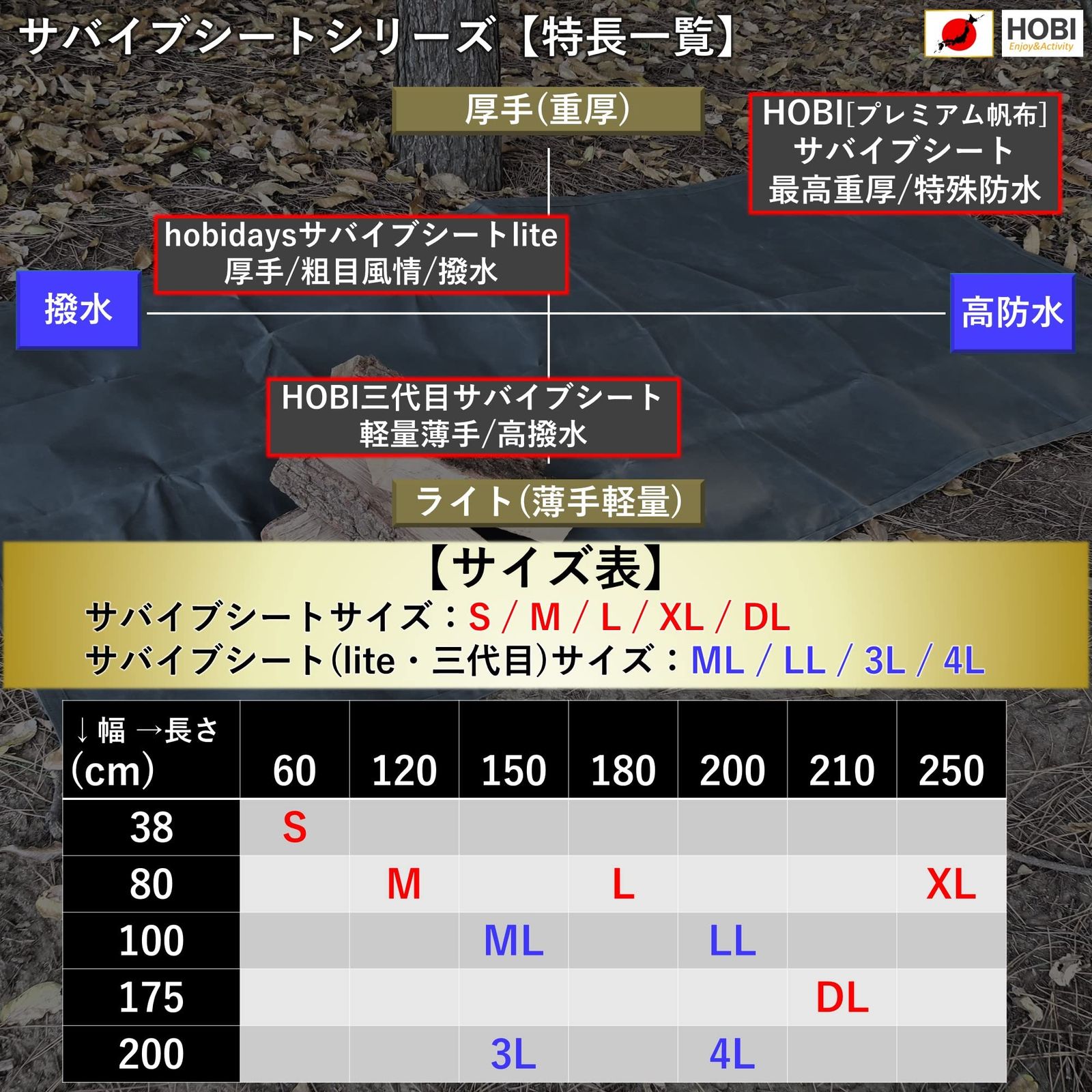特長①日本製【MADE IN JAPAN】●JIS規格L3102基準に基づいて国内で生地生産。特殊製法により実現した上質ライト帆布とパラフィン加工された三代目サバイブシートは、高い品質を保っております。JIS規格L3102は廃止となりましたが、HOBI帆布は高性能を維持すべく、糸構成、密度、重さ等が厳格な当基準を用いて生産しております。江戸時代より使用されている頑丈で分厚くしっかりした帆布は軍用テント、救急タンカ、柔道着等に使われ、非常に破けにくい綿100%の環境にやさしい素材です。非常に軽量ながら無骨にガシガシ使用出来、薪束を包んで持ち上げてもびくともしません。特殊なパラフィン(ロウ浸け)加工により高い防水性を実現し、使い込む程にビンテージ風な雰囲気を表現します。野外、キャンプ、ソロでの様々なシーン、ロケーションに活躍するシートです。