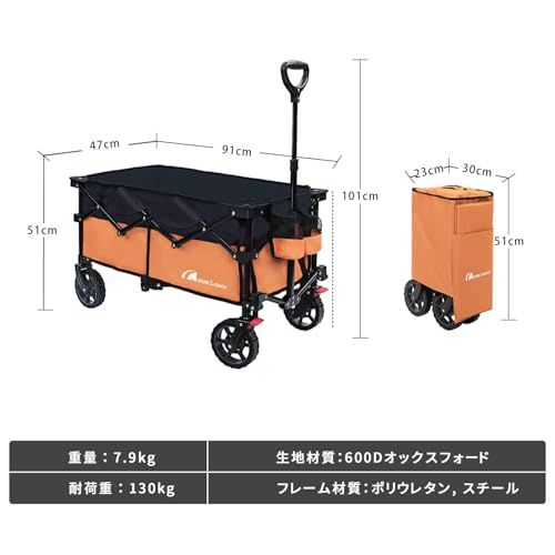 【商品仕様】使用時サイズ: 奥行き(約)91cm 幅(約)47cm 高さ(約)51cm/101cm (ハンドル 含み) 収納時サイズ:約233051(高さ)cm 本体重量:7.9kg 耐荷重:130kg 材質:フレーム -- スチール ・生地 --600D オックスフォード