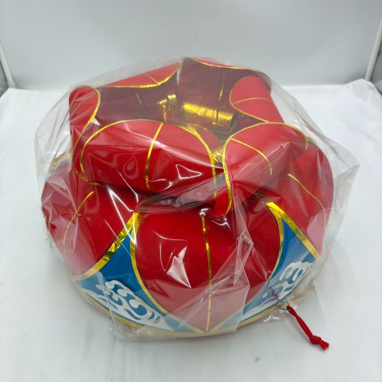 赤を基調に金色のラインと青の波模様があしらわれた伝統的なデザインで、民族舞踊、祭り、演舞、ステージパフォーマンスなど幅広い用途に活用できます。