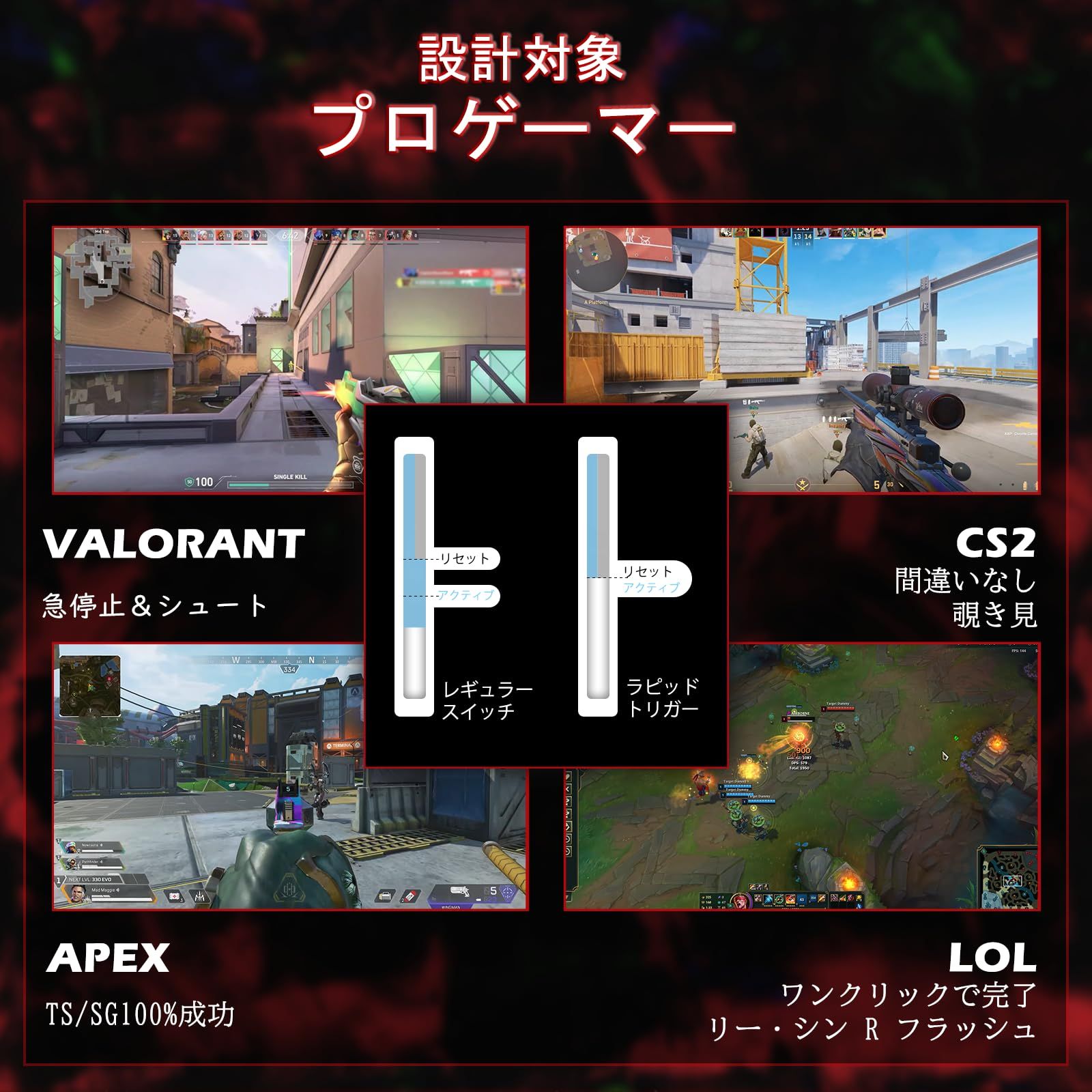 【X65proキーボードの技術基準適合証明番号:219-259048】【X11マウスの技術基準適合証明番号:219-259476 】 【競技級の反応速度を実現する磁軸メカニズム】0.01mm単位で作動点を検知する「Zero Dead Zone磁軸スイッチ」を採用。アクチュエーションポイントは0.1?3.4mmで20段階調整可能**。FPSでは浅め、RPGでは深めにカスタマイズ可能。**「ラストキー優先処理」**で同時押し時の入力競合を排除し、常に意図したコマンドを確実に反映。