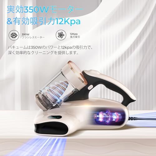 【4合1の機能で99.9%のダニ除去率を実現:強力な吸引、高周波たたき、UV除菌、55熱風乾燥】:S100 布団クリーナー 強力なダブルモーターを搭載し、より強い吸引力を提供します。350Wの安定した出力、12KPaの強力な吸引力、そして1分間に80,000回の高周波たたきにより、マットレスの奥深くに潜むほこり、ダニ、以及其他アレルゲンを効果的に振り出し、吸引します。底部のUVランプは、253.7nmの波長の紫外線を放出し、99.9%の細菌とダニを効果的に除去します。55の熱風乾燥機能により、ベッドの湿気を除去し、暖かく快適な睡眠体験を提供します。