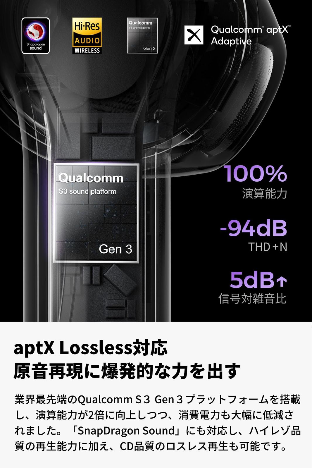 【技術がさらに進化、Snapdragon Soundとハイレゾに対応】圧倒的なパフォーマンスを誇るQualcomm製SoC「QCC3091」(Qualcomm S3 Sound Platform)の搭載により、演算能力を2倍に高めつつ消費電力は従来比で大幅に低減。音声処理能力を飛躍的に向上させ、次世代の音質と驚異的な接続安定性を両立しました。「SnapDragon Sound」の対応により、低遅延と高音質を両立し、AIRシリーズ最高クラスの高い接続品質と高効率化を実現しました。さらに最新のオーディオコーデック「aptX Adaptive Lossless」 ※もサポート、無線通信が安定している環境で最大44.1kHz/16bit(約1.1~1.2Mbps前後)のCD音質をロスレスでワイヤレス再生できます。さらに、ハイレゾワイヤレス規格にも対応しました。これにより、どこにいてもコンサートホールにいるかのようなサウンドをお楽しみいただけ、音楽体験を一新します。※Snapdragon Sound対応端末とのペアリングが必要です。