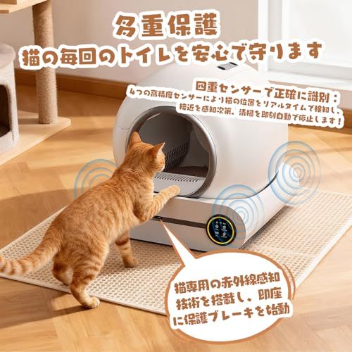 【徹底したスマート保護設計】四重スマートセンサーで猫の安全を保護します。120広角赤外線センサーおよび4つの高精度重力センサーを搭載。猫の接近や立ち入りを検知すると、清掃動作は即座に停止します。猫が退室した34分後に自動で再開。徹底的かつ包括的な安全設計で、愛猫に多重の保護を提供し、飼い主様に心からの安心