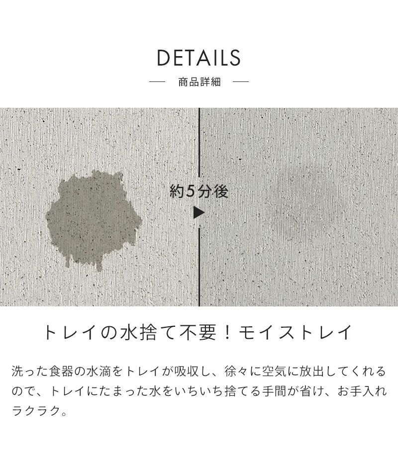 新潟県燕三条で加工された高品質ステンレス製のラックと、日本製の吸水素材「モイス」を組み合わせた水切りラック。コンパクトながら2~3人分の食器をすっきり収納でき、カゴはお皿が立てやすいワイヤー間隔で設計され、洗い物をスムーズに置けます。モイストレイは水滴を瞬時に吸収し、空気中に放出するため水捨て不要。常に清潔でお手入れもラクラクです。箸立てやグラスホルダーはお好みの位置に移動でき、使いやすさに合わせてレイアウト可能。箸立てはパンチング仕様で水切れが良く、衛生的に保てます。さらにゴム製の滑り止めが付き、安定感抜群で設置面を傷つけません。日本製ならではの堅牢な作りと機能性を兼ね備えた、コンパクトながらも大容量の水切りラックです。新生活や一人暮らしにもおすすめ。