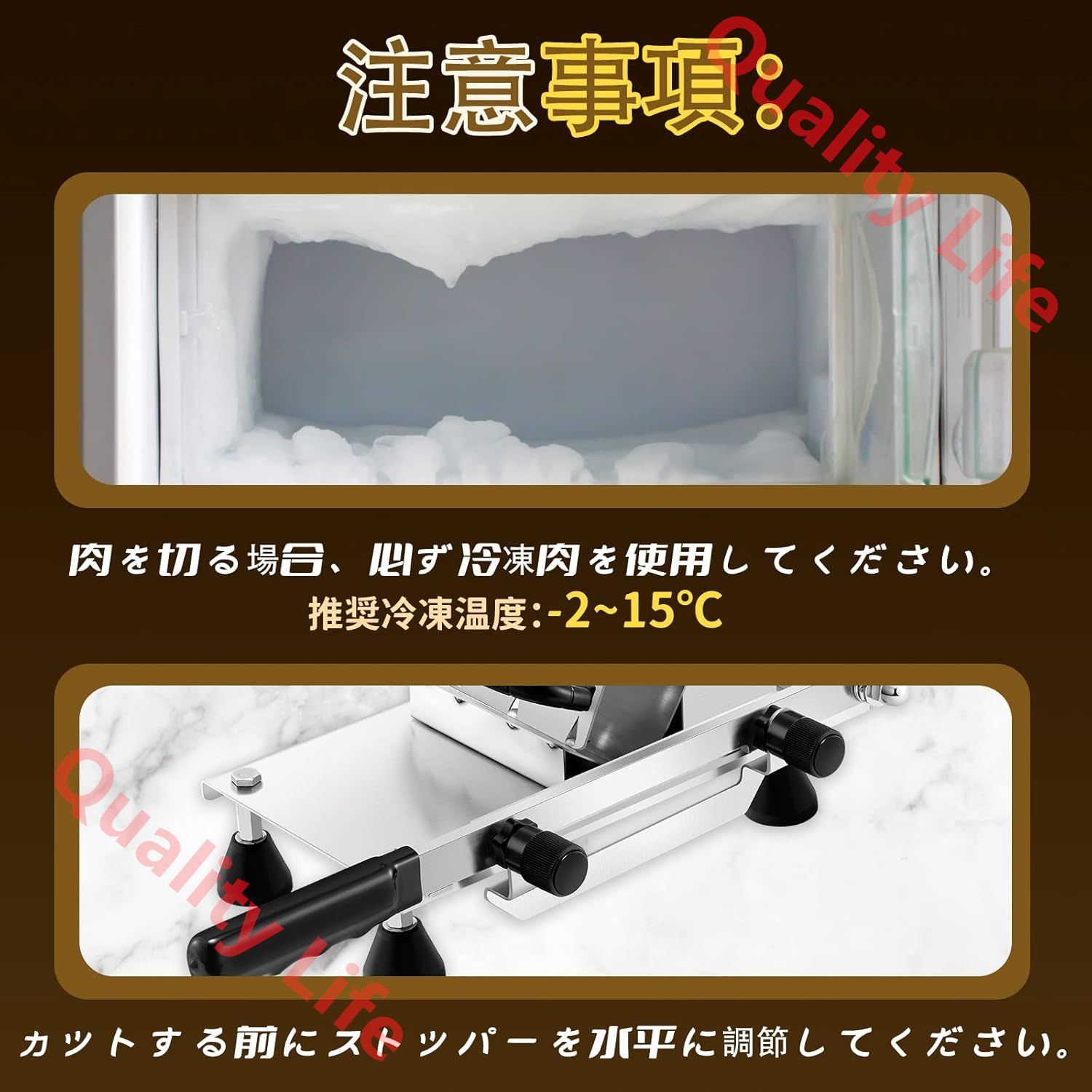 【注意事項】1.使用前に保護フィルムを剥がしてください。2.カットする前に調節用ストッパーを水平に調節してください。3.肉を切る時に解凍せず、冷凍のままにしておいてください。