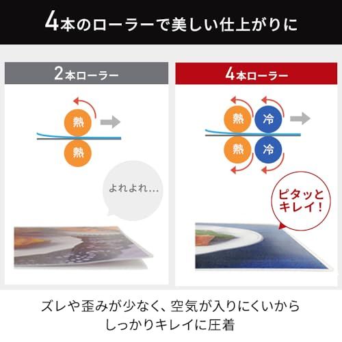 【特徴】4本のローラーで波打ちが少なく,より高画質で美しい仕上がりを実現するラミネーター.用紙につやと張りを出し,水や汚れからしっかりガードする.家庭用・業務用におすすめ。温度調節機能付きでより綺麗な仕上がりに。コンパクト収納可能で場所を取らない。安全、安心、故障防止のヒートオフ機能付き。仕上がり重視・スピード重視の方。