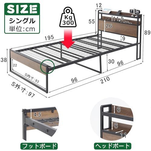 アイアンベッド カビ防止 スチールベッド 脚付き 収納付きベッド フレームのみ 高耐荷重 シングルベッド パイプベッド 2段宮棚付き 頑丈 ベッドフレーム 木製 USB 2口コンセント アッシュグレー グレー SINNONAKA