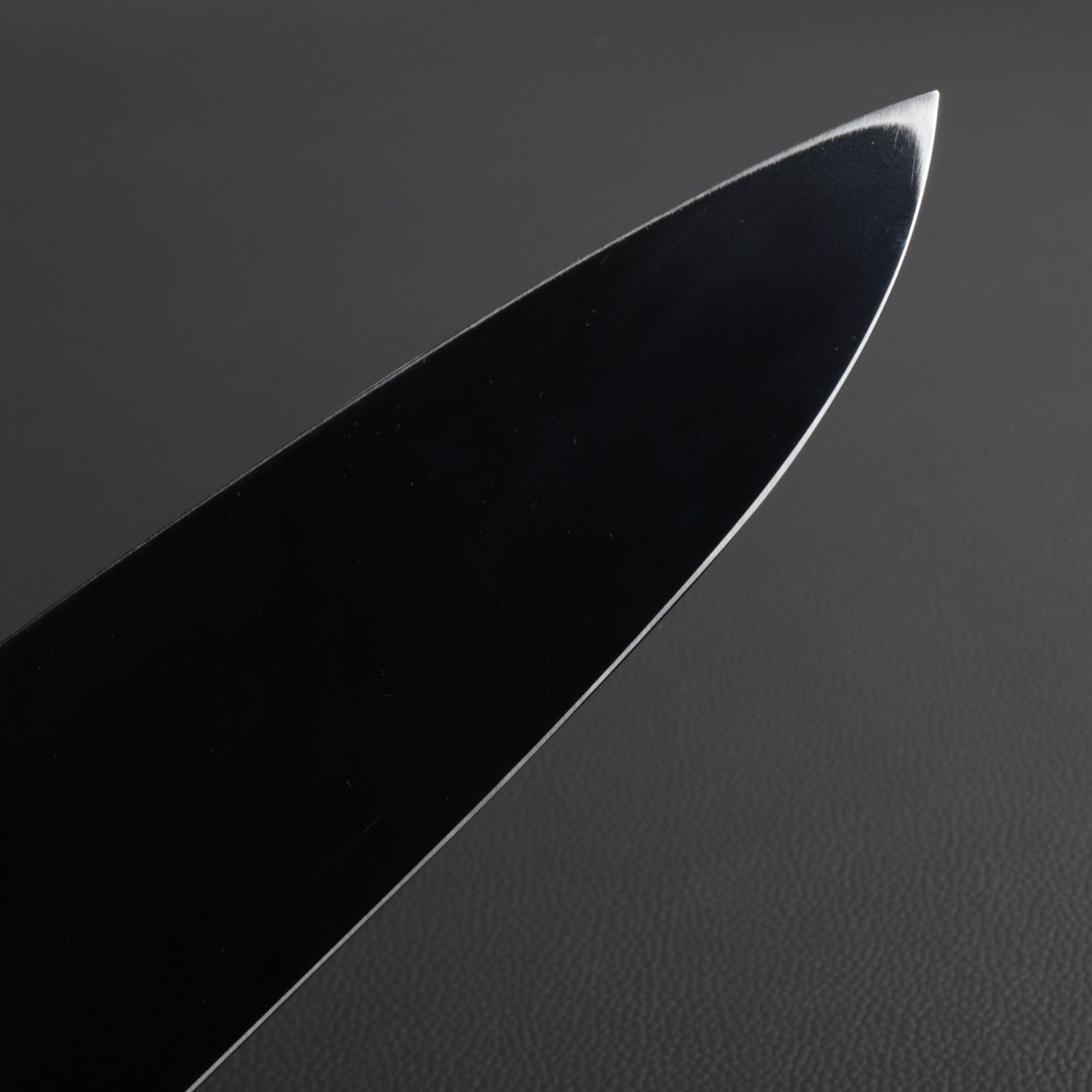 この包丁は、真空焼き入れサブゼロ処理を施し、高光沢度の鏡面仕上げ(完全手研ぎ)を採用しています。平と裏は鏡面仕上げで、美しさと高級感を兼ね備えています。切れ刃にはヘアライン仕上げが施され、細部にまでこだわった仕上がりです。また、裏押し、平研ぎ(V字)、裏すき加工を丁寧に施し、徐々に薄く仕上げることで、刃の状態を非常に良好に保っています。