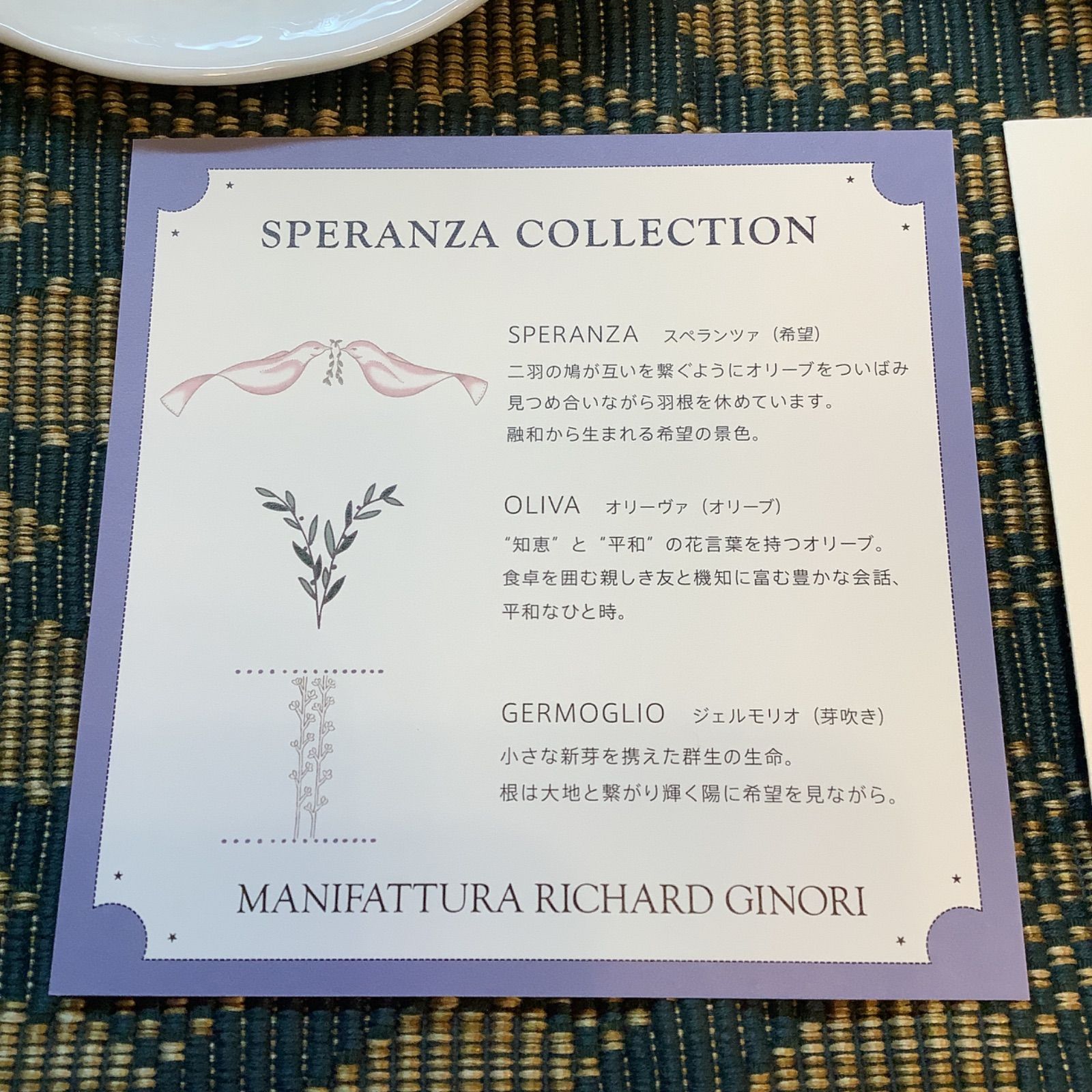 イタリアを代表する陶磁器ブランド<ジノリ1735>とデザイナー皆川明氏のコラボレーションによって誕生したテーブルウェアコレクション。「知恵」と「平和」の花言葉をもつオリーブの名を冠したこのシリーズは、友人たちと食卓を囲み豊かな会話を交わす、平和なひとときをイメージしています。柔らかなラインに、優しい色合いのオリーブモチーフで縁取りを添えた優美なデザインが魅力です。
