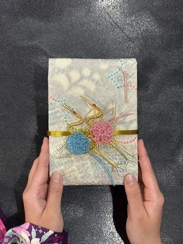 着物/帯から作られたご祝儀袋です水引もイメージに合わせて仕上げました
