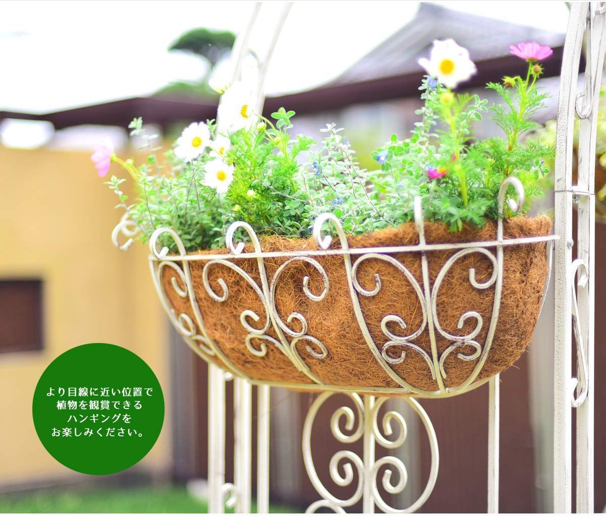 ゴージャスアイアンシリーズにハンギングバスケットが登場!アーチやフェンスなどと同様の素材を使用し、重厚感あふれる作りになっています。ヤシ繊維のパームマットが付属していますので、植え込んですぐにお使いいただけます。