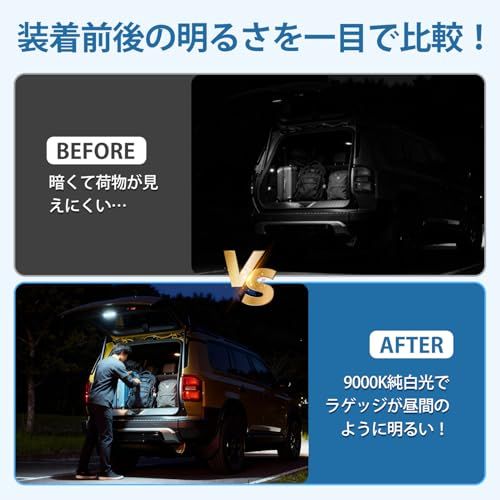 3.【高輝度・省エネ・長寿命】Virautoのラゲッジランプが36個の高輝度LEDチップを搭載しており、9000Kの純白光でラゲッジスペースを昼間のように明るく照らします。車のドア開閉に連動して自動で点灯・消灯しますので、暗い場所でも手間なく安全・快適にお使いいただけます。さらに、低消費電力でありながら安定した明るさを実現し、圧倒的な省エネ性能と長寿命を両立します。日常使いはもちろん、長時間の使用でも安心してお使いいただけます。