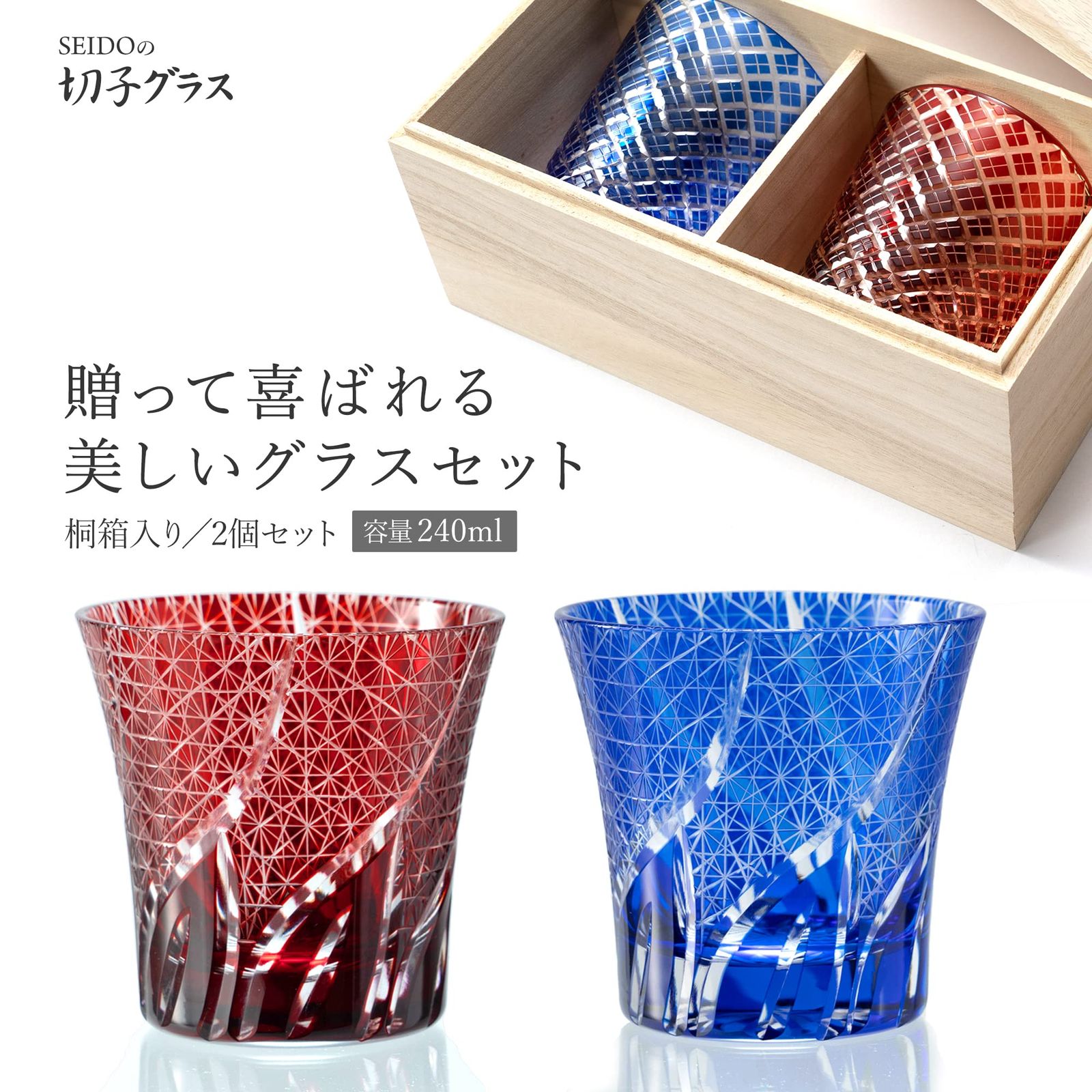 SEIDO 切子 グラス ペアセット ロックグラス オールドグラス 焼酎グラス 日本製高級桐箱入り 240ml 菊繋ぎ