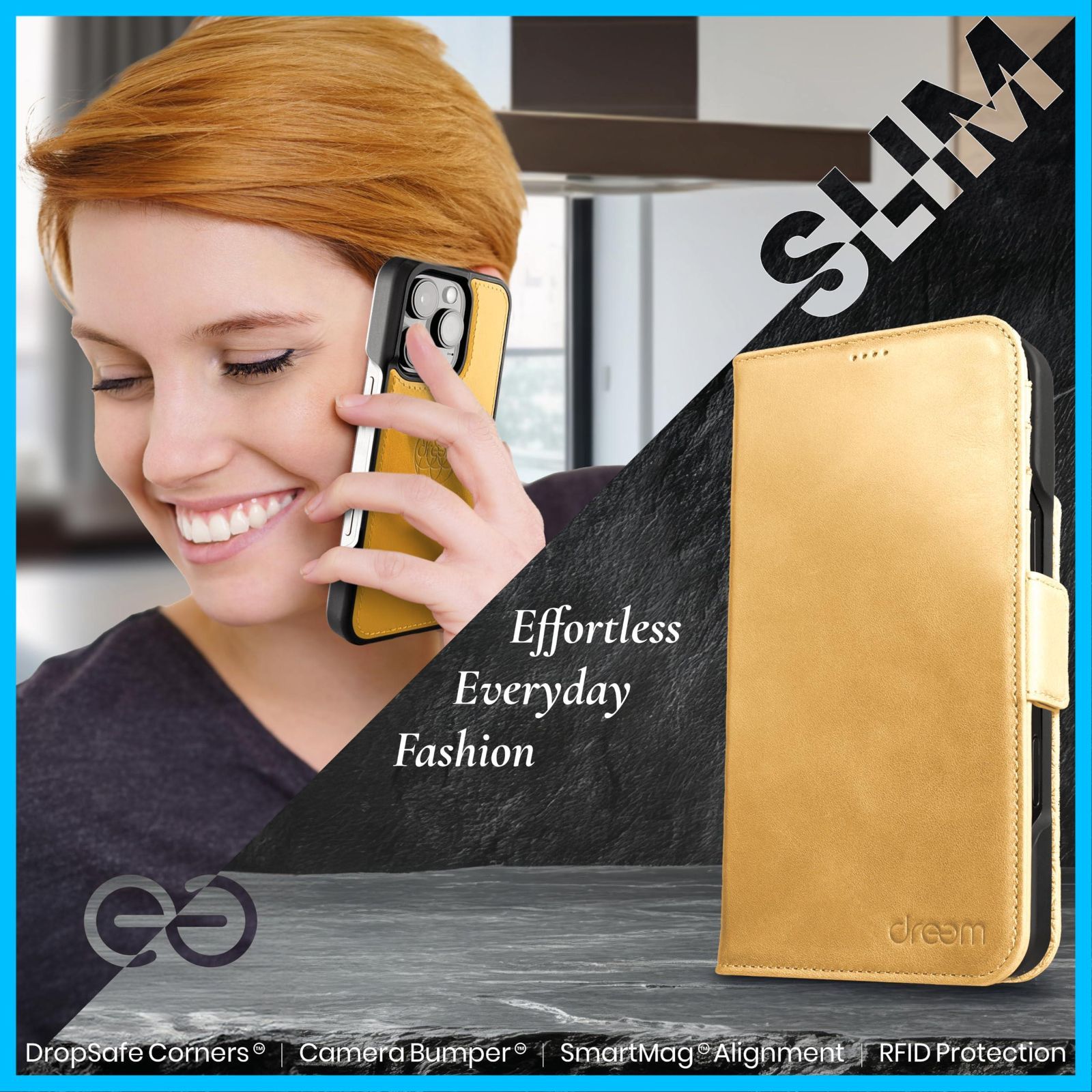 Dreem フィボナッチ(Fibonacci)2イン1 財布型ケース Apple iPhone 16 Pro Max用 - 高級ヴィーガンレザー製 マグネット着脱式 耐衝撃 携帯電話ケース RFIDカード保護機能 2通りに使えるフリップスタンド付き - [ゴールド]