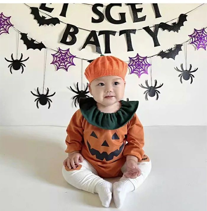 愛らしい南瓜柄たちがプリントされたカラフルで楽しいロンパース!
