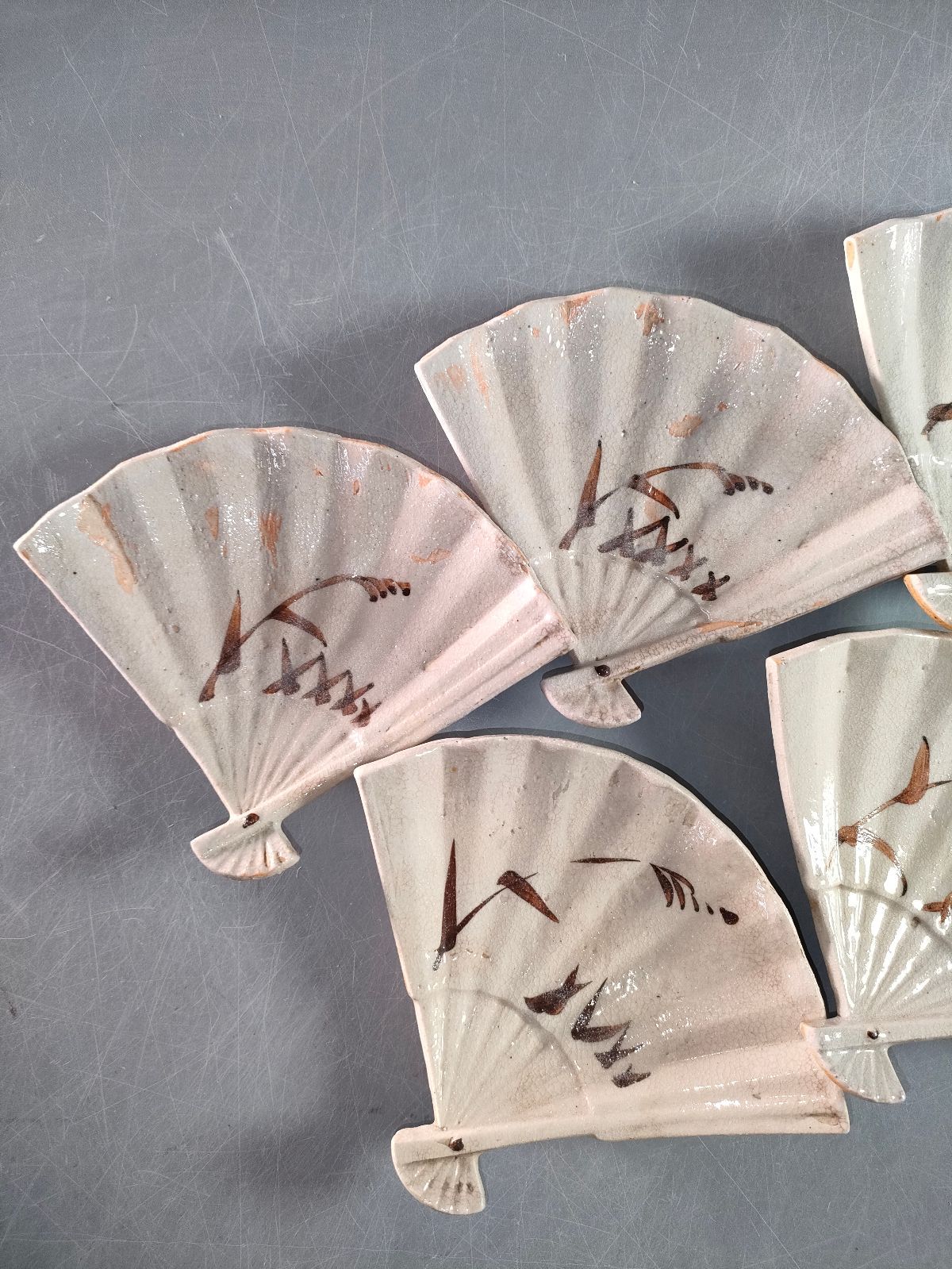 S 14 1 志野焼 絵志野扇面形足付向付5客 共箱 飾皿 菓子皿 懐石道具