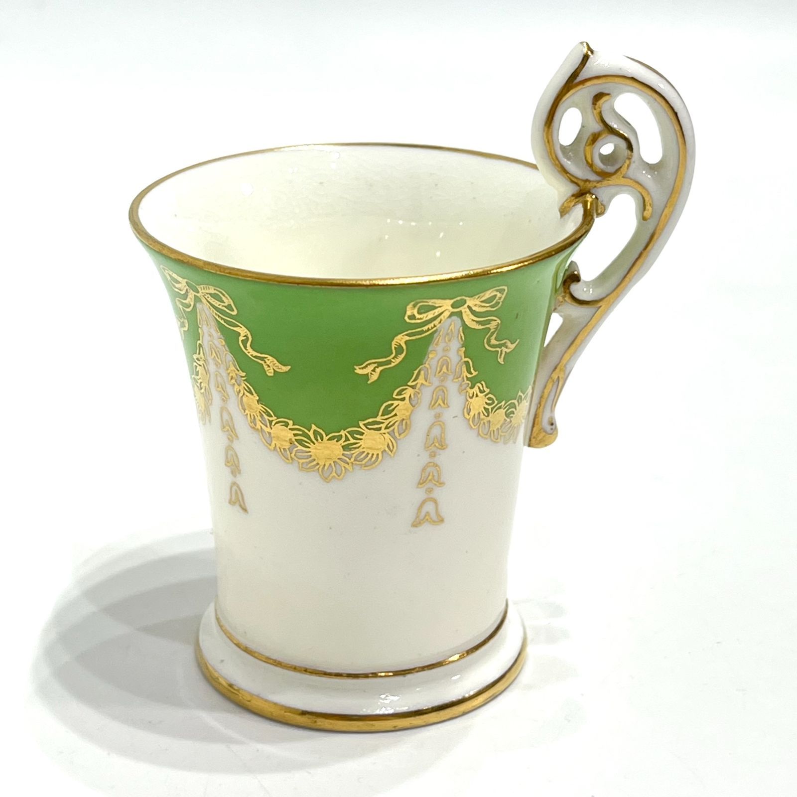 ハンドペイントの金彩の装飾、渦巻状のハイハンドル、コールポートらしい鮮やかなアップルグリーンが華やかなホットチョコレート用のカップ&ソーサー。