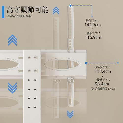 左右回転と高さ調節可能:テレビスタンド 壁寄せは左右30の首振りが可能で、どの角度からでも見やすいポジションに調整できます。テレビスタンド ハイタイプの高さを142.9cmまで調節可能です。視聴環境や家具の高さに合わせて最適な目線を実現できます。