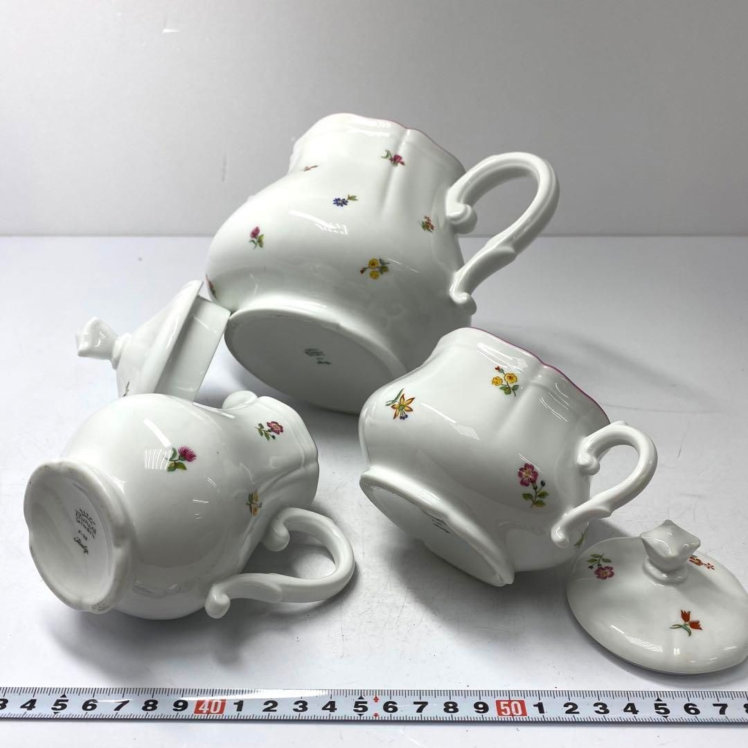 シュガーポットの取手と表面に小傷、カップの表面と縁に彩色の剥がれがあります。