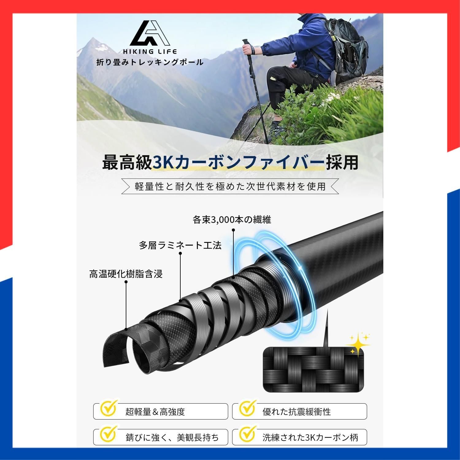Hiking Life トレッキングポール 3Kカーボン 折り畳み式 2本セット【超軽量198g 収納サイズ34cm】登山用ストック ウォーキングポール 100-120cm調整可能 収納ポーチ付き 付属品5種類 日本語説明書 登山 ウォーキング アウトドア ハイキング 遠足 散歩 高齢者