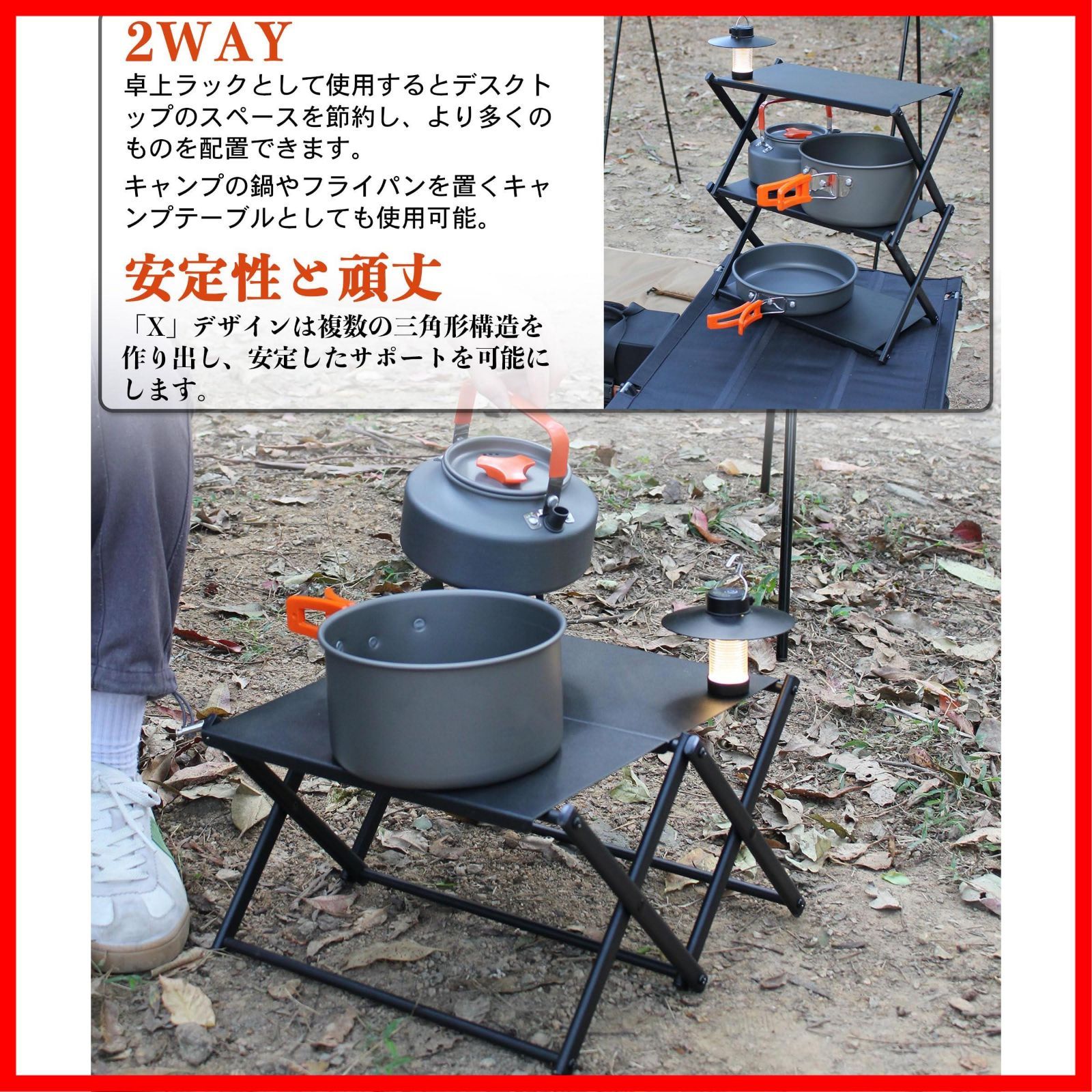 【2way】キャンプテーブルとしてもキャンプ棚としても使用可能。横に使えばアウトドア ローテーブル、縦に使えば二段キャンプ棚になります。使用シナリオやニーズに応じて、キャンプ用調理器具や小型バーナーを置くテーブルとして設置したり、調味料を置くキャンプ卓上ラックとしても使用できます。